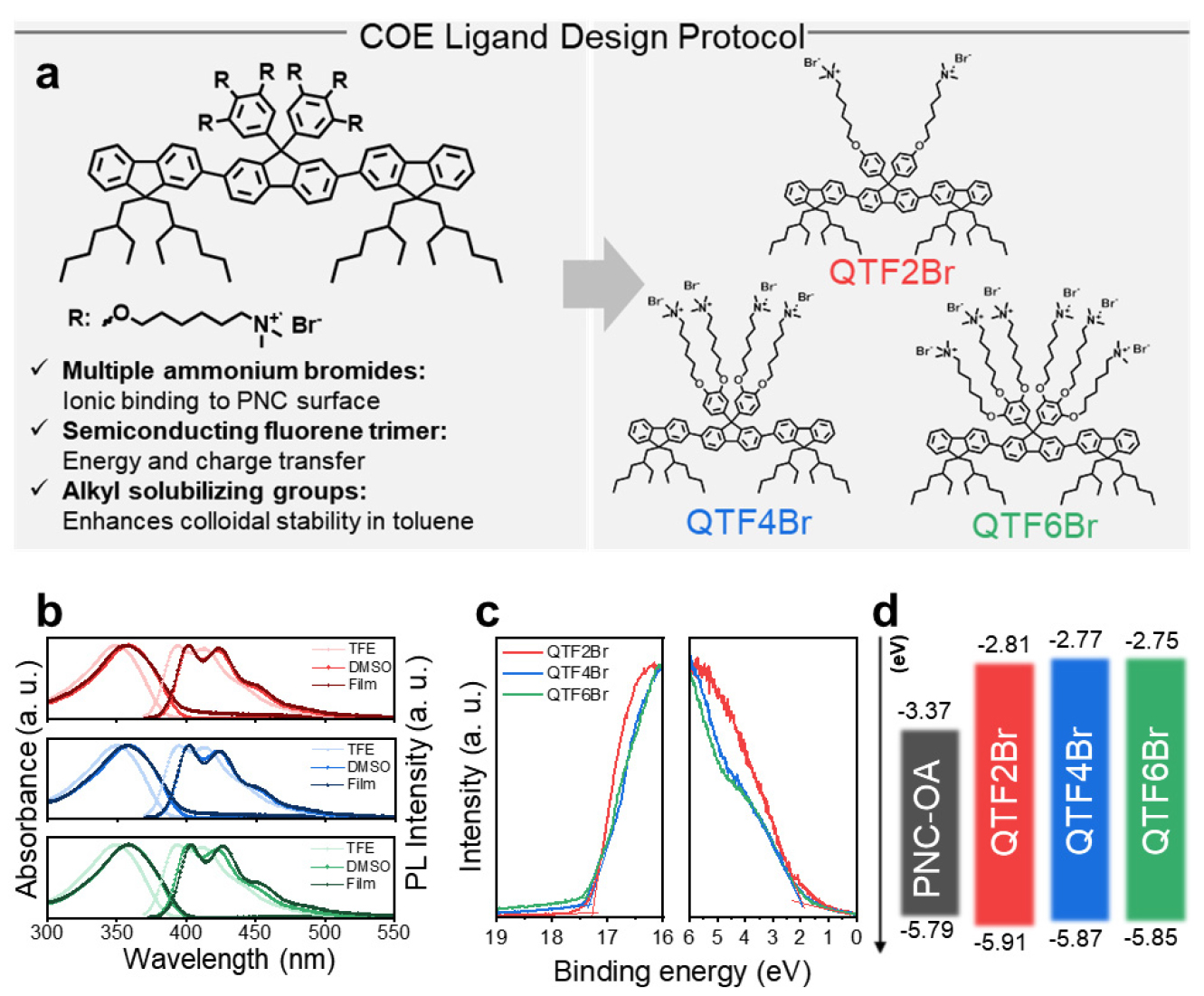 - Replacing insulating aliphatic ligands with conjugated oligoelectrolytes (COEs) enables strong binding, effective passivation, and Förster resonance energy transfer (FRET) to amplify the …
