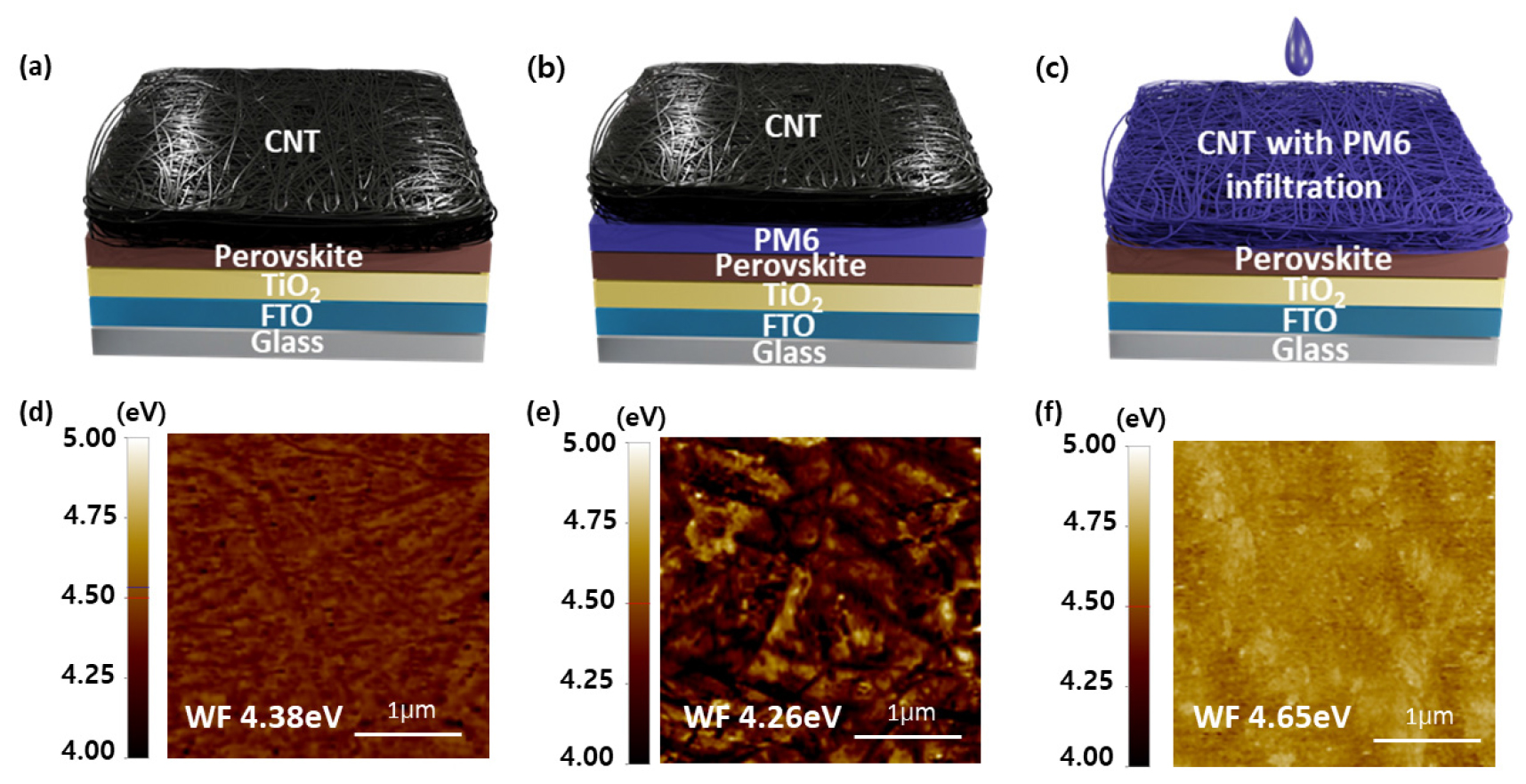 - Traditionally, expensive metals like gold or silver have been used as the rear electrode for perovskite solar cells (PSCs), which have highly efficient performance. Within this framework, carbon nanotube (CNT) electrodes have been regarded as promising low cost electrodes due to their mechanical strength and excellent electrical conductivity. In spite of these advantages, concerns have arisen about the power conversion efficiency (PCE) and stability of PSCs based on CNTs due to the porosity of CNT electrodes and interfacial issue. In this work, we introduced PM6 hole transport material infiltration method to address issues related to the porosity of carbon nanotube (CNT) electrodes, aiming to improve the performances. As a result, the infiltration of PM6 into the CNT electrode improved the interfacial contact between the CNT electrode and the perovskite layer, thereby the best PCE of 15.49% was achieved in PSCs based on CNT rear electrodes. - COLLAPSE