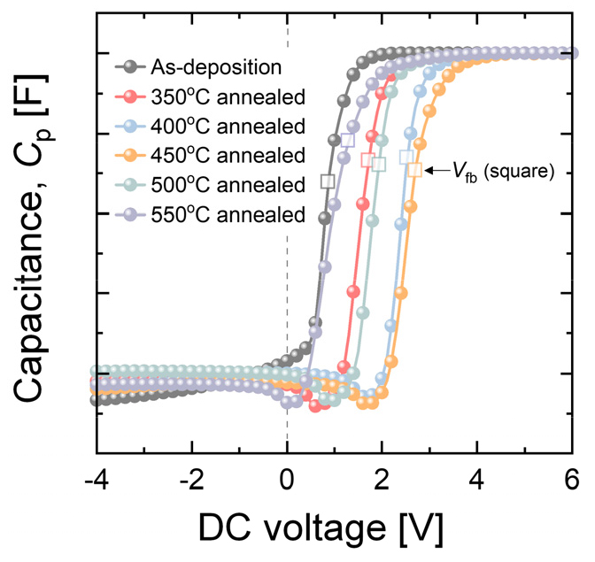 - Effective surface passivation is essential for high-efficiency crystalline silicon (c-Si) solar cells. Aluminum oxide (Al2O3) films deposited via atomic layer deposition (ALD) are a leading passivation material due to their high negative fixed charge density (Qf) and low interface trap density (Dit). However, the optimal passivation performance is highly dependent on the post-deposition annealing (PDA) temperature, a relationship that is often reported inconsistently in the literature. This study systematically investigates the integrated passivation mechanism of an ~10 nm amorphous AlOx film on c-Si. By precisely controlling the PDA temperature, we employ combined electrical, chemical, and optoelectronic analyses to link process condition to passivation performance. Our findings reveal that both the magnitude of negative Qf and the overall passivation quality are maximized at a PDA temperature of approximately 450°C. Fourier-transform infrared (FT-IR) spectroscopy confirms that this optimal performance correlates with densification and rearrangement of the Al-O network, which stabilizes negative charge centers near the interface. At higher temperatures (≥ 500°C), a clear decline in passivation is observed, which we attribute to the growth of an interfacial SiO2 layer and hydrogen loss. This study establishes a direct link between PDA temperature, structural changes, and passivation performance, providing quantitative, physically grounded guidelines for optimizing Al2O3-based passivation in high-efficiency c-Si solar cells. - COLLAPSE